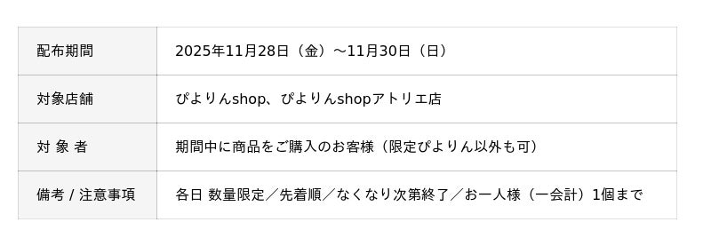 期間中に商品をご購入いただいたお客様には、感謝の気持ちを込めて限定デザインの「500万ぴよ・ありがとうぴよりん缶バッジ」をプレゼントいたします(数量限定、先着順)。チョコレートプレートとお揃いのデザインで、500万ぴよ達成の特別なアイテムです。