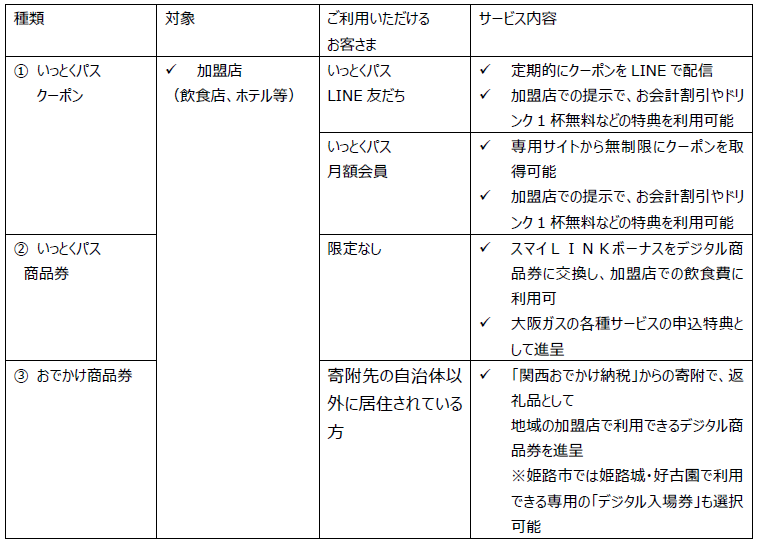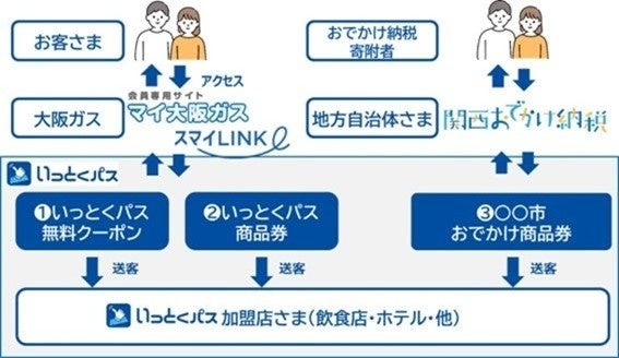 「いっとくパス」とは、大阪ガスが運営する、家庭用のお客さまと飲食店等をつなぐデジタルチケットサービスです。運用基盤として「e街プラットフォーム(R)」(運営:株式会社ギフティ)を活用しています。無料クーポンの配布やポイントによるデジタル商品券への交換等を通じて、加盟店で飲食等をお得に楽しんでいただけます。また、本デジタルインフラを活用し、現地消費型のふるさと納税である「関西おでかけ納税」およびその返礼品として地域の飲食店等で利用できる電子商品券「おでかけ商品券」も発行されています。
