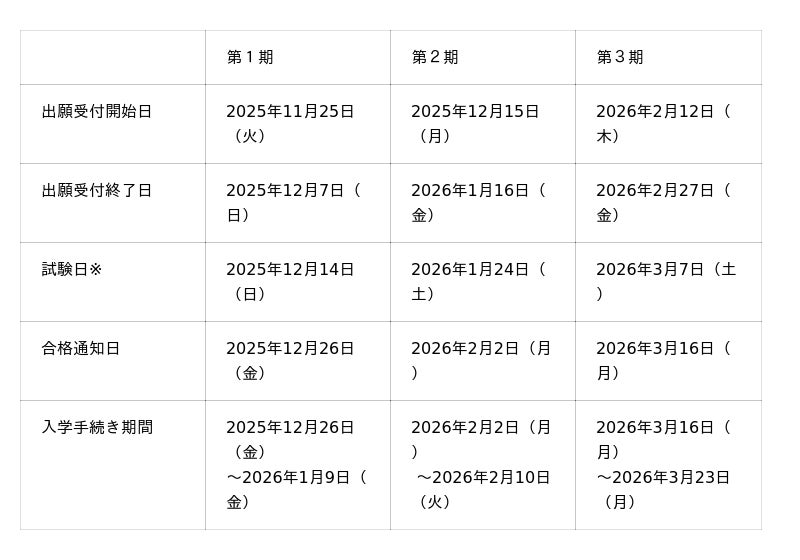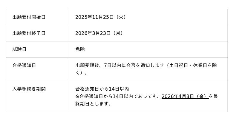 2026年4月新入学生の出願期間は第1期から第3期まであり、パスウェイ利用型特別選考【専願】では入学試験が免除されます。