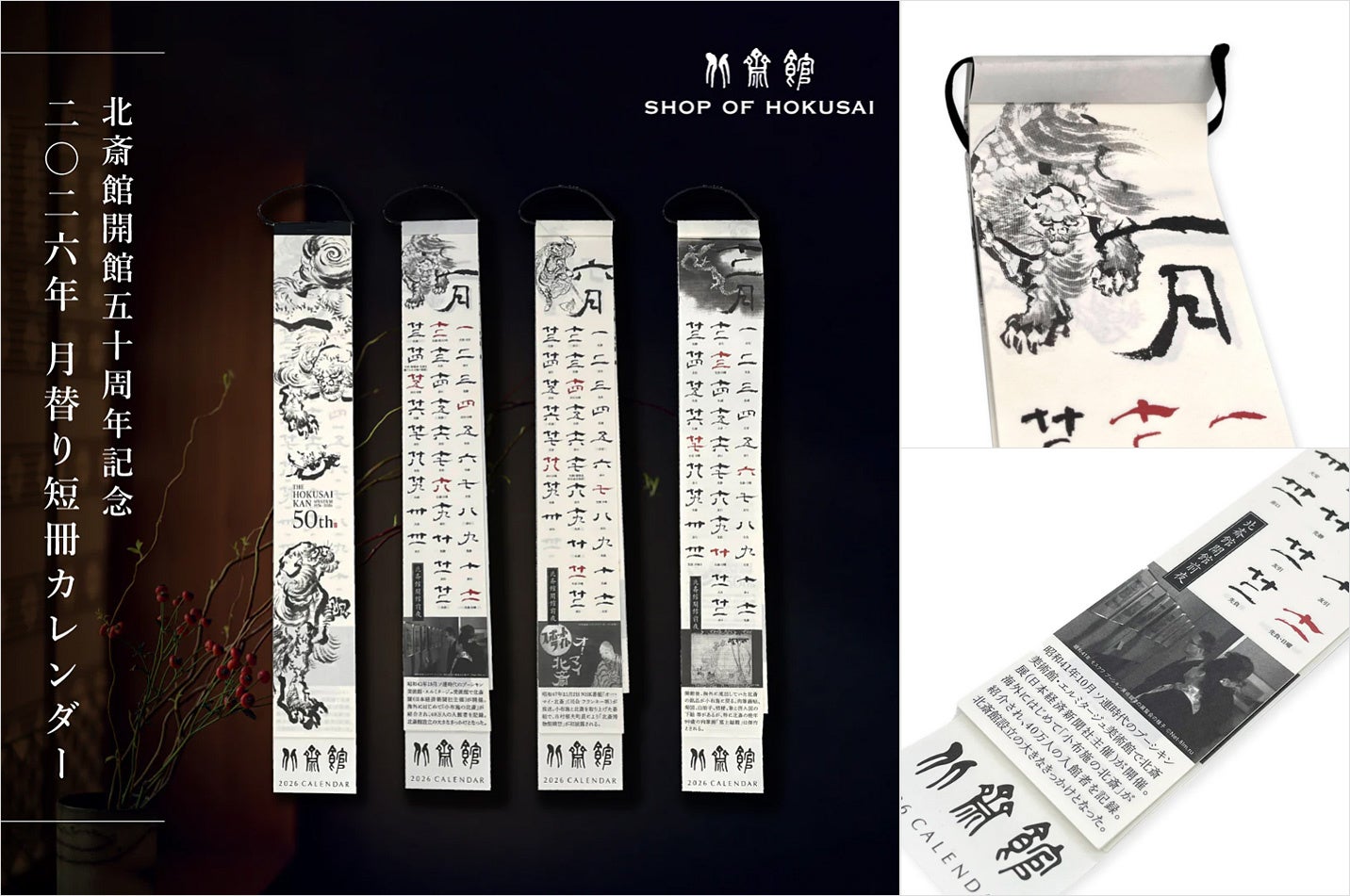 開館50周年記念 2026年月替り短冊カレンダー北斎館限定の2026年版オリジナル北斎カレンダーは、北斎が魔除けを願って日々描いた「日新除魔図」を中心に、北斎館の作品で構成しました。最終月の12月には、北斎が最晩年に描いたとされ、北斎館でも人気の高い「富士越龍」を掲載しています。