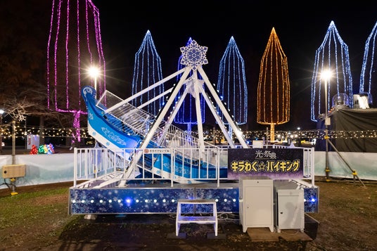 「光の祭典」は、東武スカイツリーライン竹ノ塚駅から徒歩約20分の元渕江公園で開催されるイルミネーションイベント。駅から会場までの竹の塚けやき大通りも彩られ、道中も楽しめます。光の祭典のシンボルともいえる20mを超える8本のメタセコイアのイルミネーションツリーとレーザー、光のコラボや、テーマ分けされた各エリアのイルミネーションも見どころですが、体験型のアトラクションが多いことも特徴。昨年大人気だった、メリーゴーランドやバイキング船(無料。実施日時や対象等は下記会場図またはホームページをご覧ください)のほか、新企画として「わくわく♢HANABI(花火型電飾)」を実施。ボタンを押すと色とりどりの花火が打ちあがります。