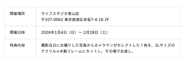 東京都港区・青山エリアにあるライフスタジオ青山店では、2026年1月4日(日)~2月28日(土)の期間、「撮影したその日」に2Lサイズのアクリル×木製フレーム付き写真をそのままお持ち帰りいただける冬のスペシャル撮影キャンペーンを実施いたします。家族写真・こども撮影を検討されているママ・パパに向けて、貸切スタジオ・衣装無料・撮影当日データ納品など、安心してご利用いただける内容をご用意しています。
