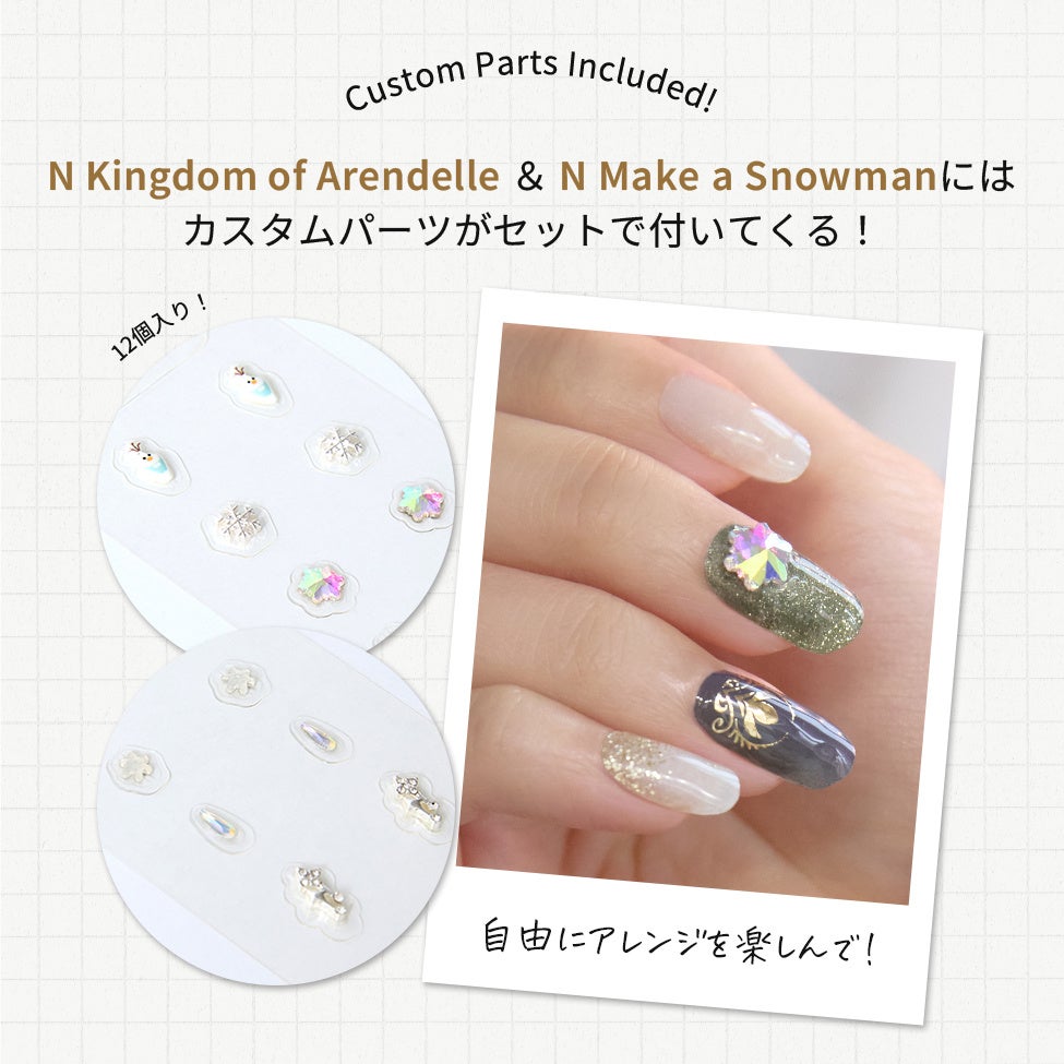 N Make a Snowman ¥2,300(税込)※カスタムパーツシール付き幼い「アナ」が「エルサ」と一緒に過ごしたかった瞬間をモチーフにしたデザインです。アレンデール城の中にある「エルサ」の部屋のドアからインスピレーションを得たデザインと、雪の結晶パターン、そしてシルバーグリッターが調和し、ロマンチックな冬のきらめきを指先に表現しました。優しく光るマグネットグリッターは、指先にふわりと雪が舞い降りたかのような雰囲気を演出し、ホログラムの箔で描かれたスノーフレークのアートが愛らしいアクセントになります。パッケージに同梱されている「オラフ」「雪の結晶」などのカスタムパーツでデコレーションすれば、また違った仕上がりに。自由自在に楽しめるデザインです。