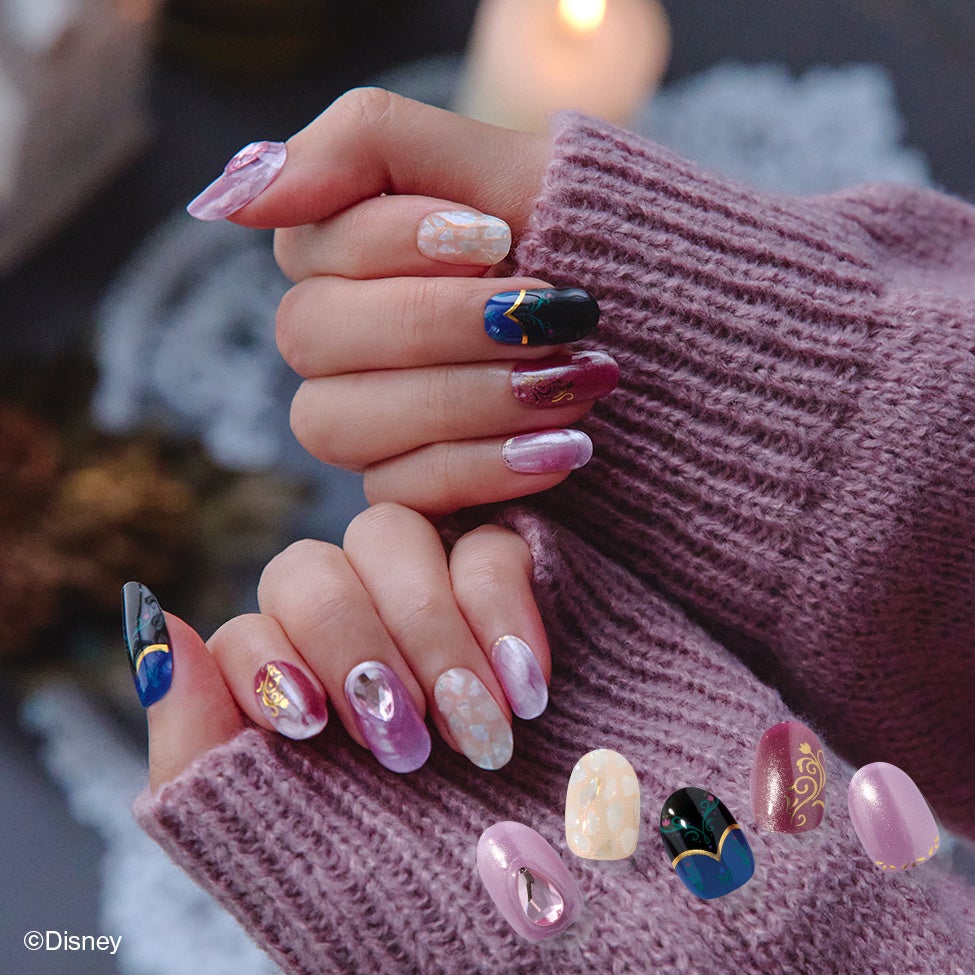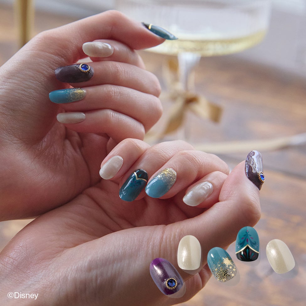 N Elsa’s Velvet Frost ¥2,300(税込)「エルサ」の戴冠式の衣装からインスピレーションを得たデザインは、落ち着いたベルベットのようなパープルと澄んだブルーが調和し、上品でクラシカルな雰囲気を演出します。「エルサ」の装飾品をモチーフにしたブルーのクリスタルカスタムパーツが、指先に唯一無二の存在感を放ちます。また、雪の結晶のモチーフは、「エルサ」の魔法の力をイメージし、キラキラと輝くアートを完成させます。繊細に流れるマグネットグリッターが銀世界のようなミステリアスなムードを添え、ゴールドの箔が華やかさをプラス。特別な日にもぴったりのデザインです。落ち着いたカラーの中に高級感を溶け込ませたネイルで、あなたの冬のスタイルに優雅なアクセントを加えてみませんか。