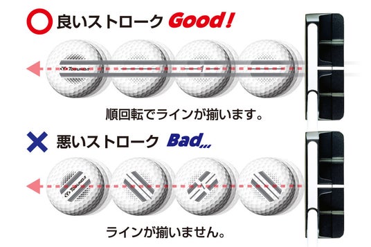 アライメントスタンプが4面に入っていることで、目標に向かって構えやすくなります。また、4面アライメントはパッティング時に綺麗な純回転が生まれると1本のラインに見えることで、ボールの軌道を確認しやすくします。