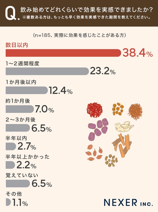 続いて、飲み始めてどれくらいで効果を実感できたかを聞いてみました。