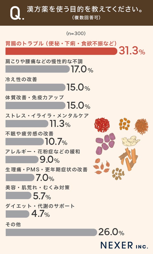 ということで今回は「漢方みず堂」と共同で、事前調査で「漢方薬を利用したことがある」と回答した全国の男女300名を対象に「漢方を使った目的」についてのアンケートを行いました。