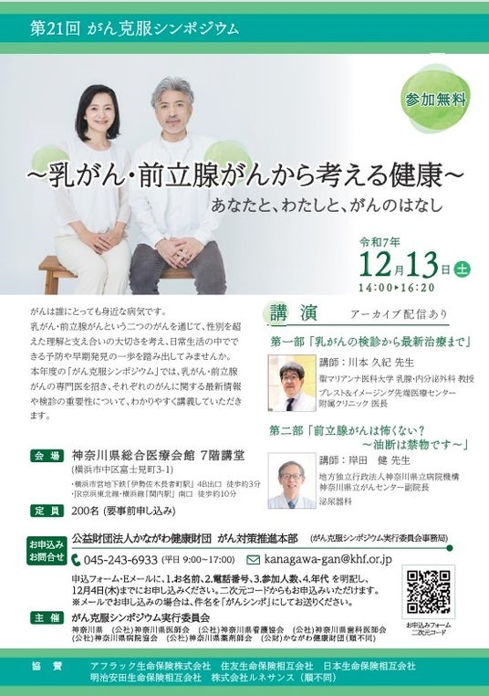 県では、県民の皆様が日常生活の中で取り組める「がんの未病改善」に向けた生活習慣づくりや、がん検診の普及のため、平成17年度から「がん克服シンポジウム」を開催しています。今回は、乳がん・前立腺がんという二つのがんを通じて、性別を超えた理解と助け合いの大切さを考え、日常生活の中でできる未病改善について考えるきっかけとなるよう、それぞれの専門医から、がん検診の重要性や最新情報について講演していただきます。