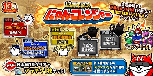 ポノス株式会社(本社:京都府京都市、代表取締役:辻子依旦、以下「ポノス」)はスマートフォン向けゲームアプリ「にゃんこ大戦争」13周年を記念して、2025年11月27日(木)11:00から「13周年記念イベント」の第2弾を開始いたしました。