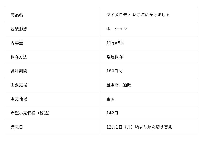 かわいいマイメロディが、「いちごをもっとおいしくする」れん乳仕立てソースをさらに魅力的に演出。パッケージの選択肢が増えることで、購買体験に選ぶ楽しさをプラスします。数量・期間限定なので、特別感やコレクション性も高まり、ファンの期待に応えます。使うときはもちろん、キッチンに置いているだけでも気分が上がるかわいいデザインで、マイメロディが好きな方へ、日常の中にちょっとした癒しを届けるアイテムです。
