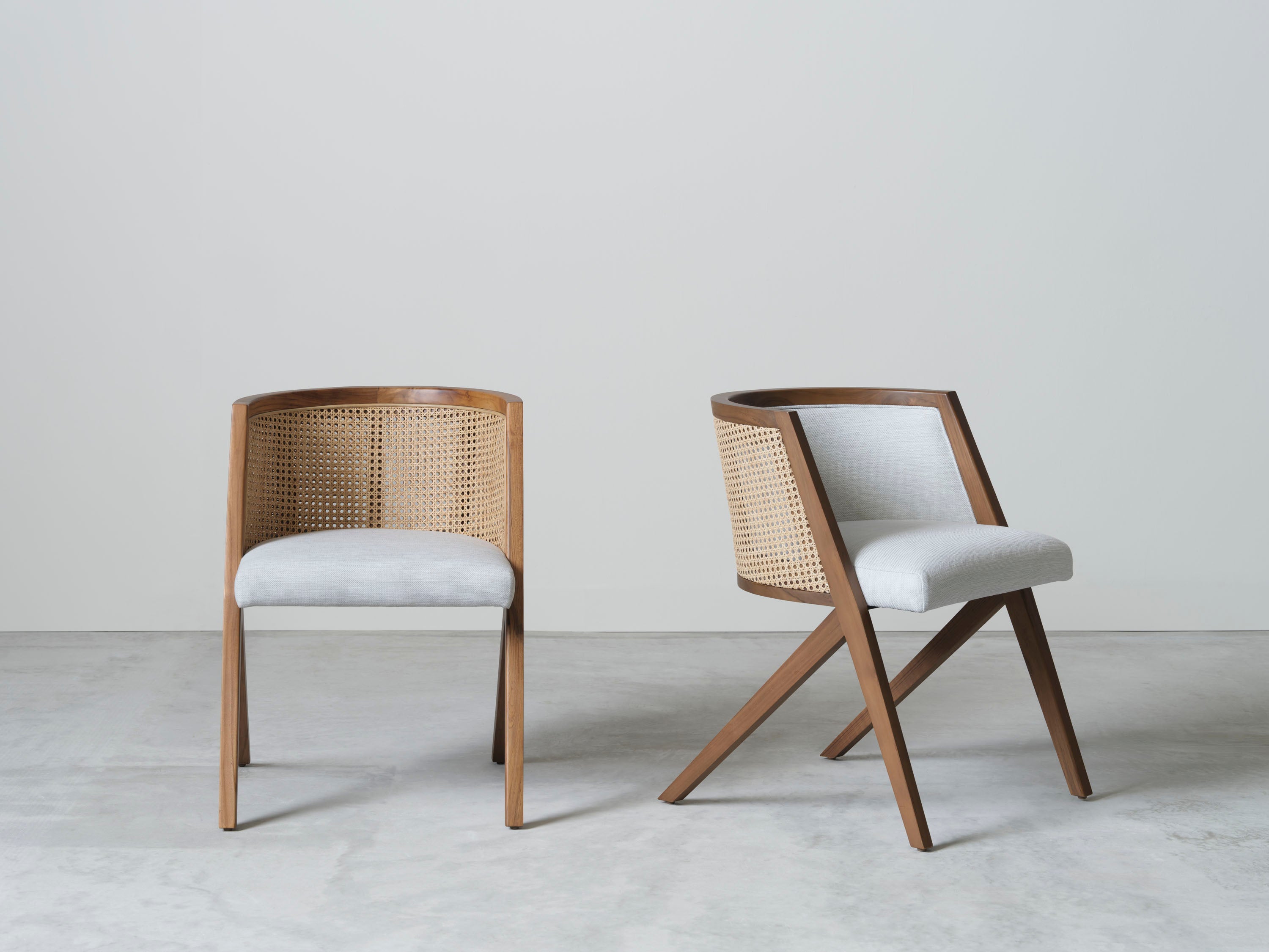 籐の軽やかさと木の構造美が響き合う、現代的なダイニングチェア。