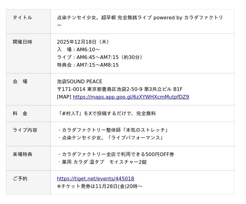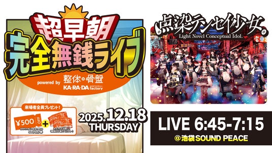 整体×骨盤サロン「カ・ラ・ダ ファクトリー」(以下 カラダファクトリー)を展開する株式会社ファクトリージャパングループ(本社:東京都千代田区、代表取締役社長:高橋 健介、以下 ファクトリージャパン)は、2025年12月18日(木)に、池袋SOUND PEACEにおいて、人気アイドルグループ「点染テンセイ少女。」(通称:テンテン / 所属事務所「KABUKIMONO’DOGs」 東京都豊島区、代表:大城 文哉)とタッグを組み「点染テンセイ少女。超早朝 完全無銭ライブ powered by カラダファクトリー」を開催いたします。