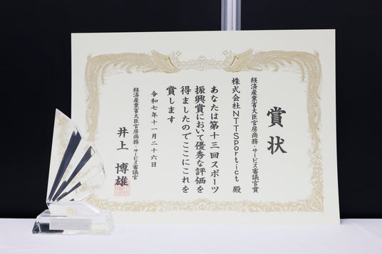 株式会社NTTSportict(本社:大阪市 代表取締役社長 中村正敏、以下 NTTSportict)は、2025年11月26日(水)に東京ビッグサイトにて開催された「第13回スポーツ振興賞」授賞式において、NTTSportictが提供している「スポーツDXを活用したまちづくり『マチスポ』」が「経済産業省 商務・サービス審議官賞」を受賞したことをご報告いたします。