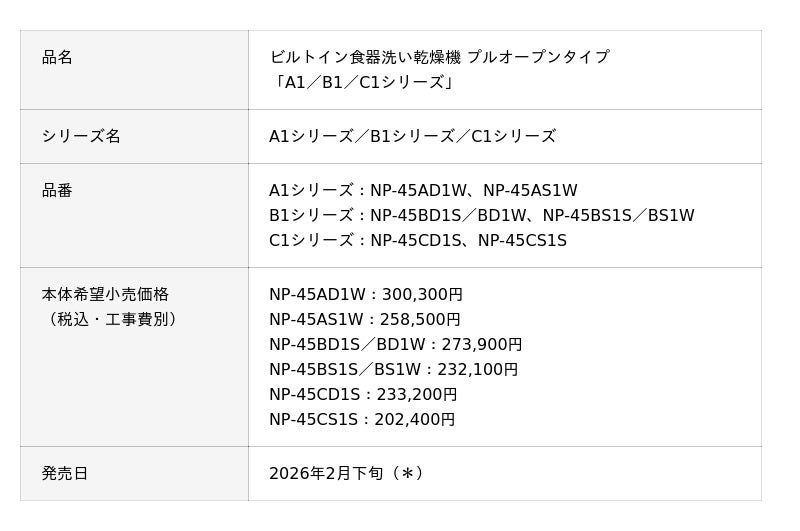 パナソニック株式会社(以下、パナソニック)は、独自の洗浄システムにより業界No.1(※1)のスピード洗浄を実現したビルトイン食器洗い乾燥機「A1/B1シリーズ」をはじめ、使いやすさを追求した「C1シリーズ」を2026年2月下旬(*)に発売します。