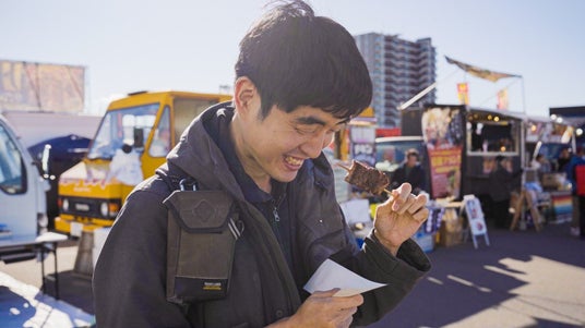 ▲画像:目当てのキッチンカーにたどり着きグルメを笑顔で堪能する参加者