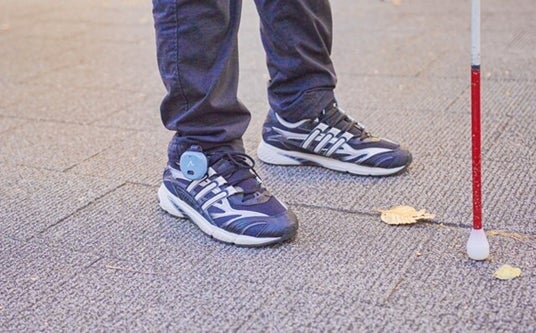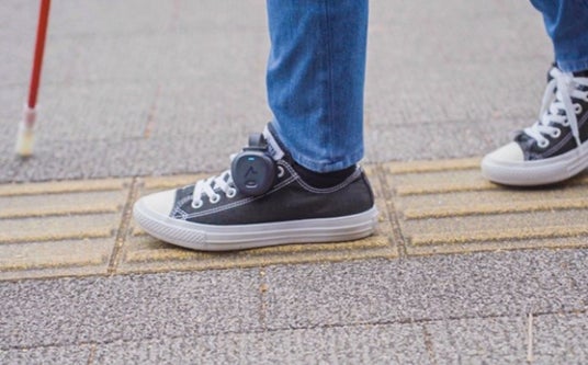 ▲画像:スニーカーに装着された振動ナビゲーションデバイス「あしらせ」