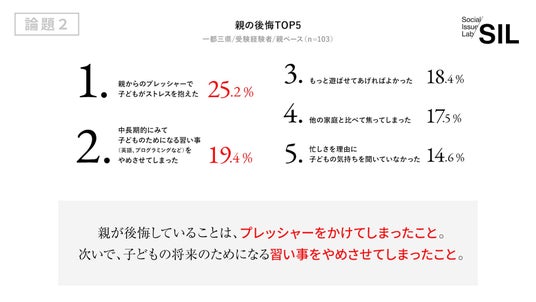 親に対して中学受験に関する“後悔”を尋ねたところ、4人に1人の親が「自分のプレッシャーで子どもがストレスを抱えてしまったこと」を後悔していることがわかりました。 次いで、「子どもの将来に役立つ習い事をやめさせてしまったこと」も約2割の親が後悔していると回答しています。