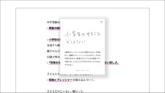 スクロールすると「中学受験」に関する問題文が出現。下線部をクリックすると、調査結果を元にした中学受験の課題や受験当事者の子どもの本音(アンケートの回答)が表示されます。