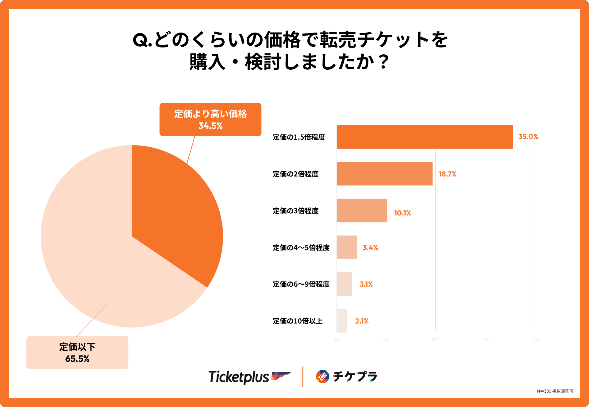 また、転売チケットの購入価格について質問したところ、転売チケットに接触したことがある人の内、3人に1人(34.5%)が定価より高い価格で転売チケット購入・購入検討をしていました。その多くは、「定価の1.5倍程度」(35.0%)で、中には「定価の10倍以上」(2%)の取引もあったことが判明しました。