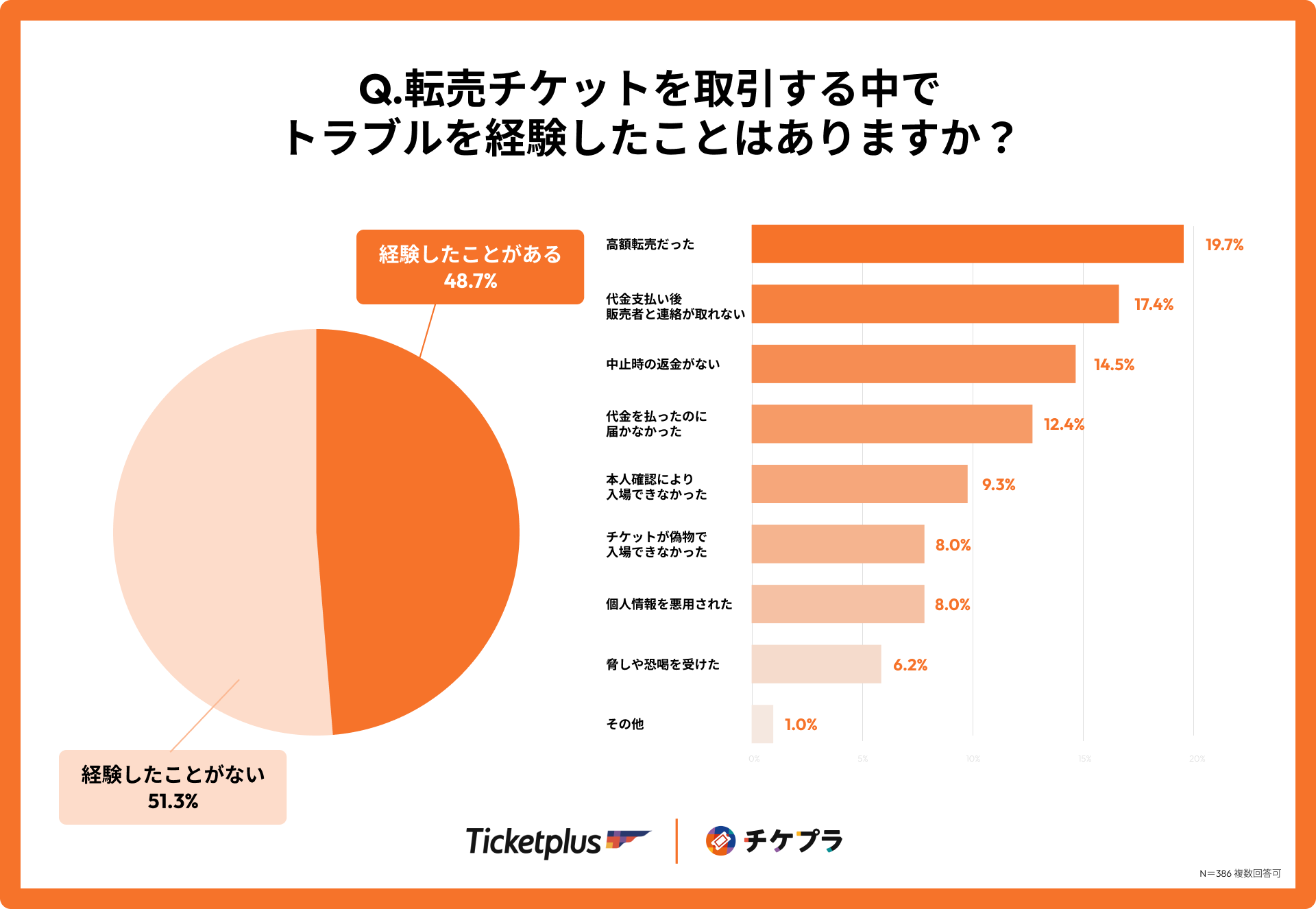 転売チケットの取引の中でトラブルを経験したかどうかの質問をしたところ、転売チケットに接触したことがある人の内、2人に1人(48.7%)が転売取引で何らかのトラブルを経験していることがわかりました。