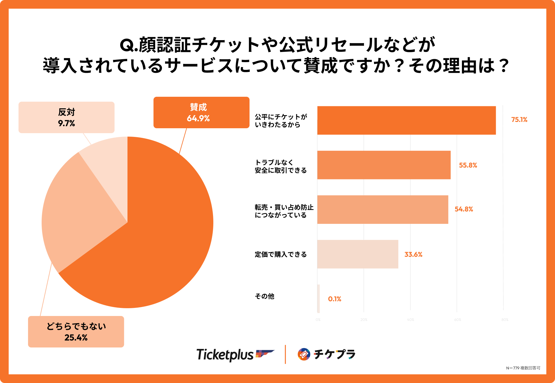 また、転売防止のために顔認証・公式リセールを導入するチケットサービスが増えていることついて、64.9%が顔認証・公式リセールなどの転売防止システムに賛同していることがわかりました。