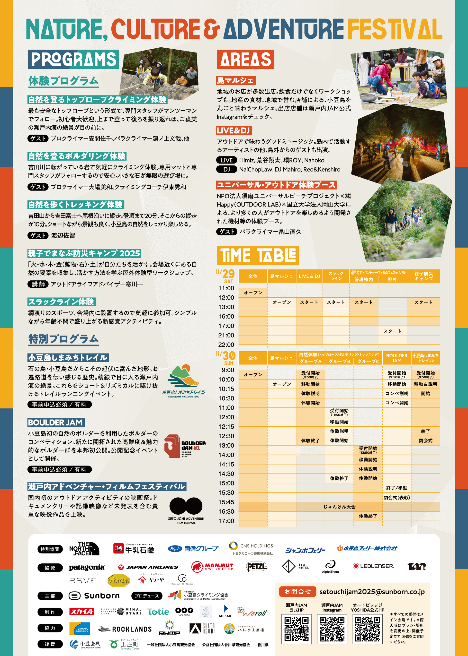 また、アウトドアとカルチャーを融合した体験コンテンツも充実。29日には、環ROY、荒谷翔大、Himiz、NaiChopLawらが出演する「LIVE & DJ」が行われ、ステージ脇ではアーティストのShutieによるライブペイントも実施。同時開催の「第3回 瀬戸内アドベンチャー・フィルムフェスティバル 2025」では、自然や冒険をテーマにした映像作品が上映されます。