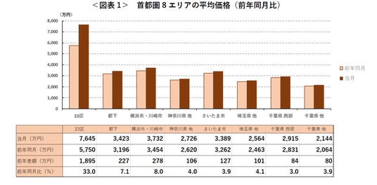 首都圏の1戸あたり平均価格は、前月比、前年同月比ともに上昇した。