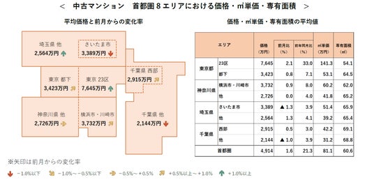 ●首都圏の中古マンション1戸あたり平均価格は4,914万円。前月比、前年同月比ともに15カ月連続で上昇。6カ月連続して8エリア全てで前年同月を上回る。