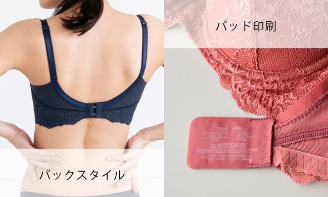 背中側にはレースを使用、段差がつきにくく、後ろから見ても美しいシルエットをキープできます。また、パッド印刷によって、肌にあたる不快感を軽減させていることや、伸びのよいストラップを採用して、肌当たりのやさしさにこだわっていることも特徴です。
