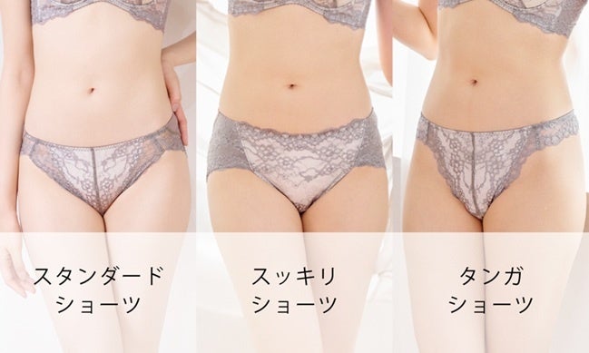 お尻をすっぽり包んでくれる「スタンダードショーツ」、お尻のカーブに沿うことでお尻の形を整えてくれる「スッキリショーツ」、総レースでヒップの丸みをキレイに見せてくれる「タンガ」も展開。気分に合わせて、ブラと合わせる一枚を選ぶことができます。