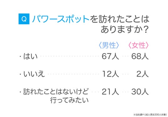 「訪れたことはないけど行ってみたい」と回答した人も2割強いることから、9割以上の人がパワースポットに興味があるということになります。