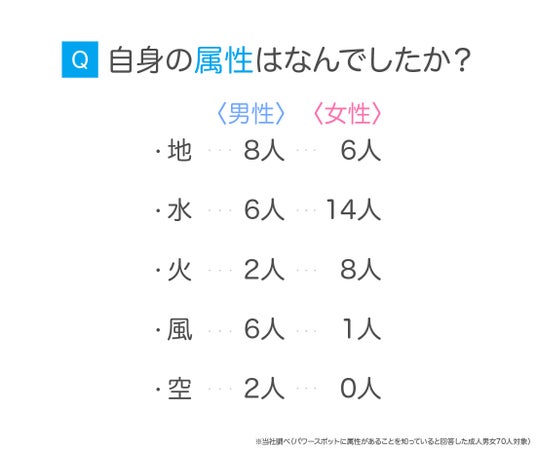 パワースポットに訪れることが一般的になっている一方で、属性の認知度は低いことがわかります。