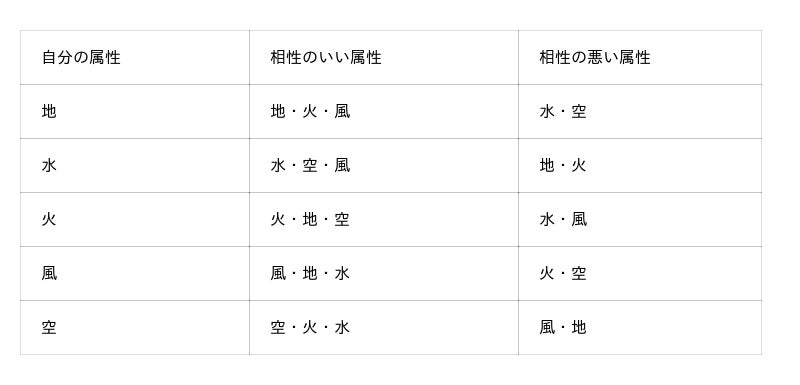 それぞれの属性別の「相性のいい属性」「相性の悪い属性」「相性のいいパワースポット」は以下の通りです。