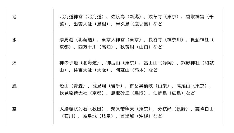人もパワースポットも、自然の構成要素である「地」「水」「火」「風」「空」のいずれかの属性を持っているとされています。