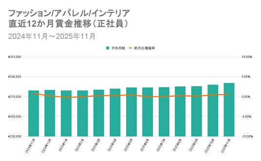 1位の「ファッション/アパレル/インテリア」と17位の「ホテル/旅館/ブライダル」における直近12か月の月給推移を比較すると、「ファッション/アパレル/インテリア」では、2024年11月の276,276円から2025年11月の283,786円まで、緩やかながら着実な上昇傾向を維持しています。