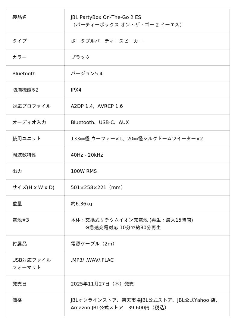 ハーマンインターナショナル株式会社(本社:東京都千代田区、代表取締役:桑原拓磨)は、アメリカ カリフォルニア発祥の世界最大級のオーディオブランドであり、日本においてワイヤレススピーカー7年連続販売台数No.1※1に輝く「JBL」より、持ち運びに便利なショルダーストラップを付属し、100WのパワフルなJBLプロ・サウンドをポータブルで楽しめるパーティースピーカー「JBL PartyBox On-The-Go 2 ES(パーティーボックス オン・ザ・ゴー 2 イーエス)」を2025年11月27日(木)よりJBLオンラインストア、楽天市場JBL公式ストア、JBL公式Yahoo!店およびAmazon JBL公式ストアにて限定発売いたします。