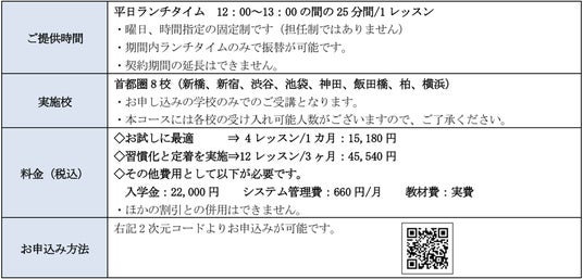 株式会社イーオン(本社:東京都新宿区、代表取締役社長:重野卓、以下「イーオン」)が運営するハオ中国語アカデミーは、首都圏8校にて通常50分間のレッスンを平日ランチタイム限定で25分間のハーフレッスンを提供いたします。