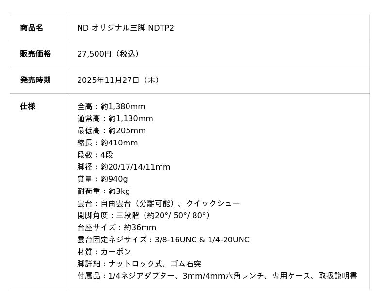 株式会社ニコンの子会社、株式会社ニコンイメージングジャパンは、公式オンラインショップ「ニコンダイレクト」の限定商品として「ND オリジナル三脚 NDTP2」を2025年11月27日(木)に発売します。