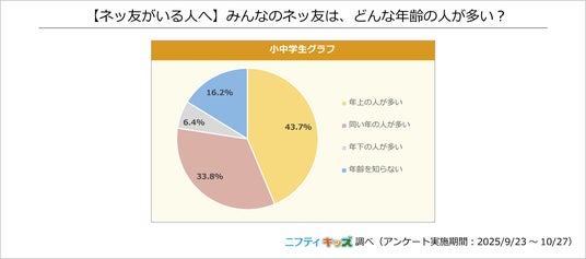 「年上の人が多い」という選択肢がもっとも多く、割合は43.7%でした。次いで「同い年の人が多い」が選ばれ、現代の小中学生はネットを通じて同年代以外の人と関わる機会が多いことがうかがえます。