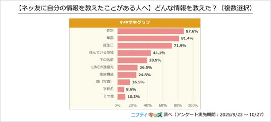 さらに「ネッ友に自分の情報を教えたことがあるか」という質問に対しては、ネッ友がいる小中学生の7~8割以上が「ある」と回答しました。なかでも「年齢」「性別」「誕生日」は、ネッ友に教える情報として上位を占めています。