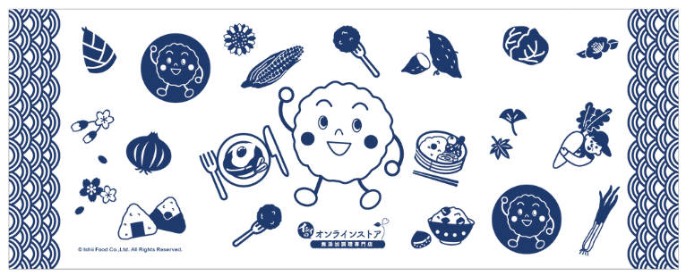 福袋の「常温」、「バラエティ」、「親子」、「こども」をご購入いただいた方に、この福袋のためにデザインしたオリジナルの「ミート君手ぬぐい」をプレゼントします 。材質は岡生地を使用しました。デザインは、まん丸のミート君を中央に配置し、「1年が丸く収まるように」との願いを込め、両端には、平和や平穏を願う伝統的な文様である青海波(せいがいは)をあしらっています 。季節のモチーフなどを配置し、石井食品が大切にする「地域と旬」を感じていただける手ぬぐいです。※「冷凍食品福袋」と「アウトレット福袋」には手ぬぐいは付きません