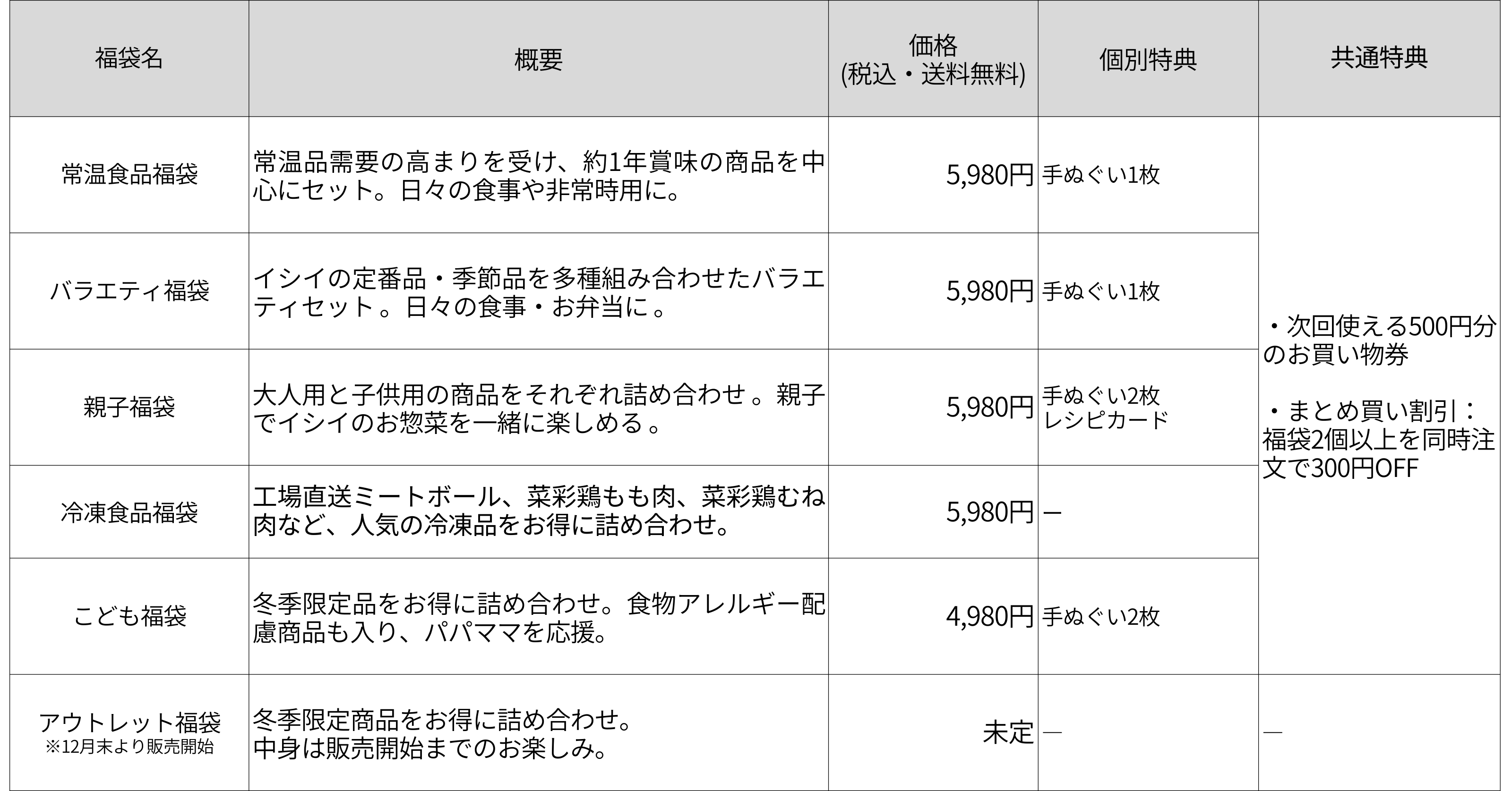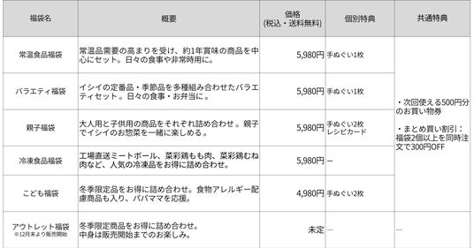 常温食品を詰め合わせた常温福袋やイシイの定番品を集めた福袋など豊富な6種のラインアップを用意しました。共通特典として、次回使える500円お買い物券や、まとめ買い割引が付きます。※アウトレット福袋を除く