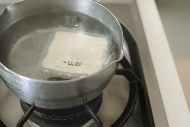 鍋にパックのまま豆腐を入れ、かぶるくらいの水を注いで中火にします。沸騰したら弱火にして、3分待つだけ!