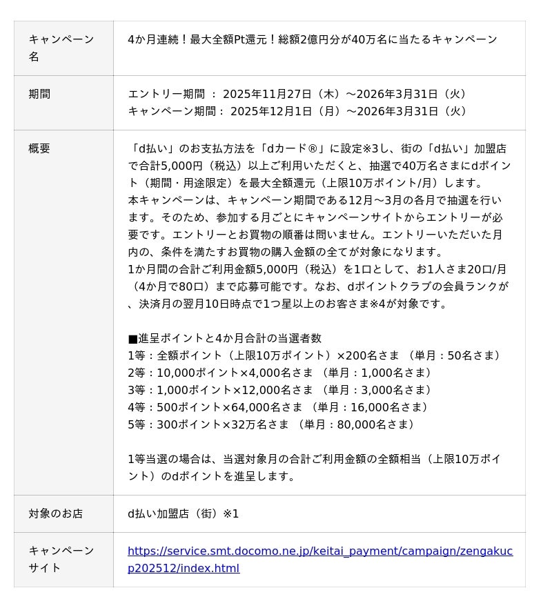 株式会社NTTドコモ(以下、ドコモ)は、街のお店※1で「d払い(R)」を合計5,000円(税込)以上ご利用いただくと、抽選で40万名さまにdポイント(期間・用途限定)を最大全額還元※2する「4か月連続!最大全額Pt(ポイント)還元!総額2億円分が40万名に当たるキャンペーン」(以下、本キャンペーン)を、2025年12月1日(月)から2026年3月31日(火)まで開催します。