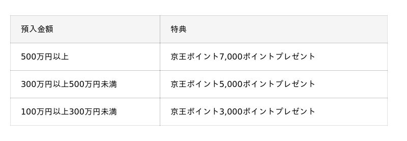 キャンペーン期間中、京王NEOBANKの円定期預金3ヵ月ものに対象金額以上を新たに預入れ、満期まで保有する。