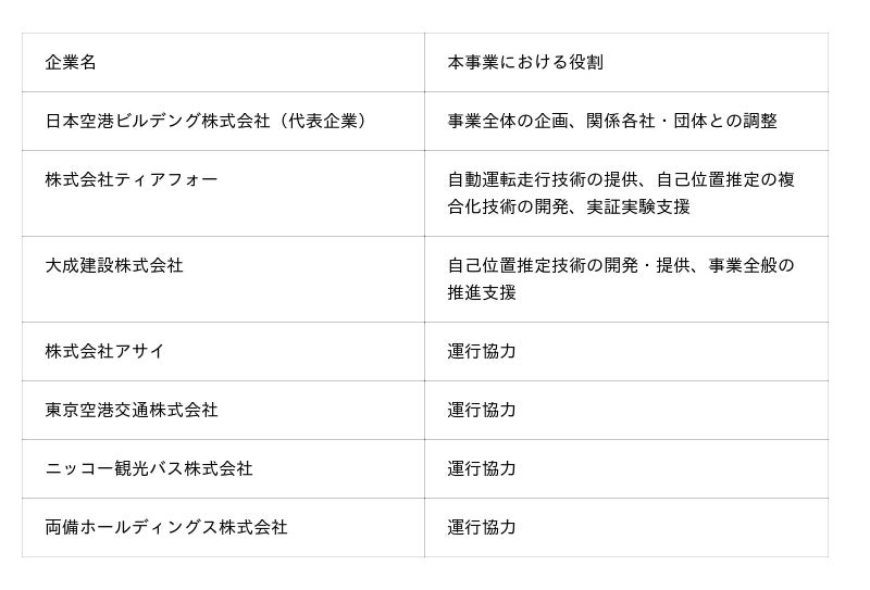 日本空港ビルデング株式会社、株式会社ティアフォー、大成建設株式会社、株式会社アサイ、東京空港交通株式会社、ニッコー観光バス株式会社、両備ホールディングス株式会社は、東京都スタートアップ戦略推進本部が実施する東京ベイeSGプロジェクト「先行プロジェクト」*¹において、「次世代モビリティ(自動運転)」分野の提案が採択*2されたことをお知らせします。