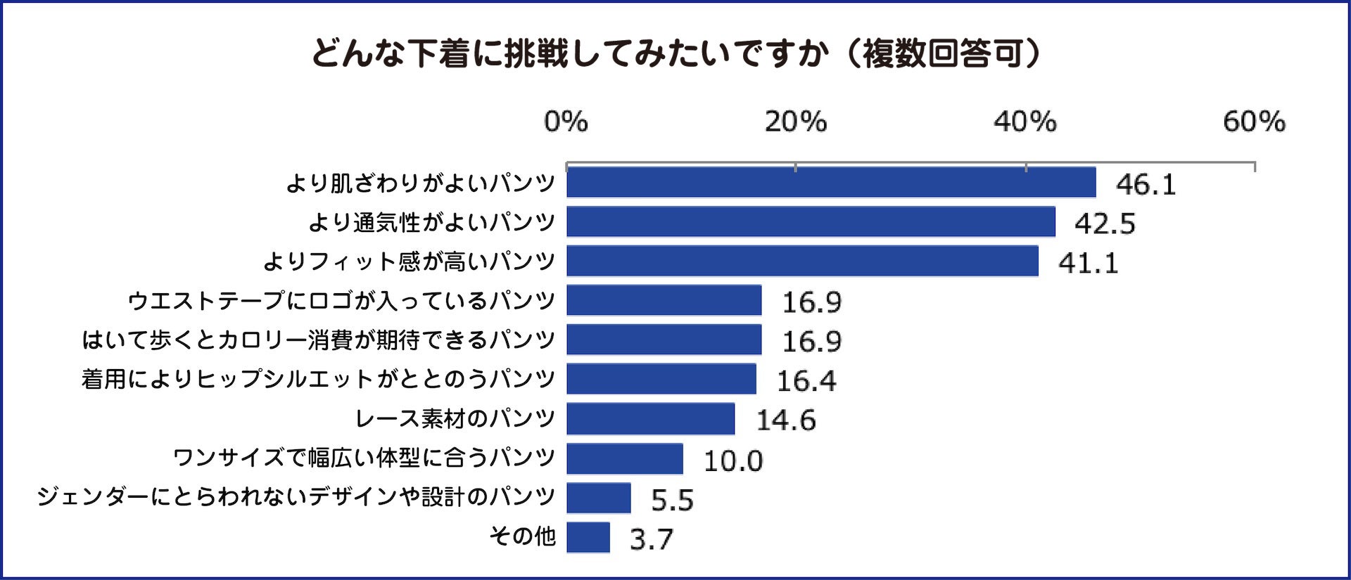 近年は、下着のバリエーションがますます豊富になっています。そこで、「挑戦してみたい下着のタイプ(複数回答可)」について質問したところ、1位「より肌ざわりがいいパンツ(46.1%)」、2位「より通気性がいいパンツ(42.5%)」、3位「よりフィット感が高いパンツ(41.1%)」が上位に(※)。快適さを求めて新たな下着にチャレンジしたい意向があることがうかがえます。