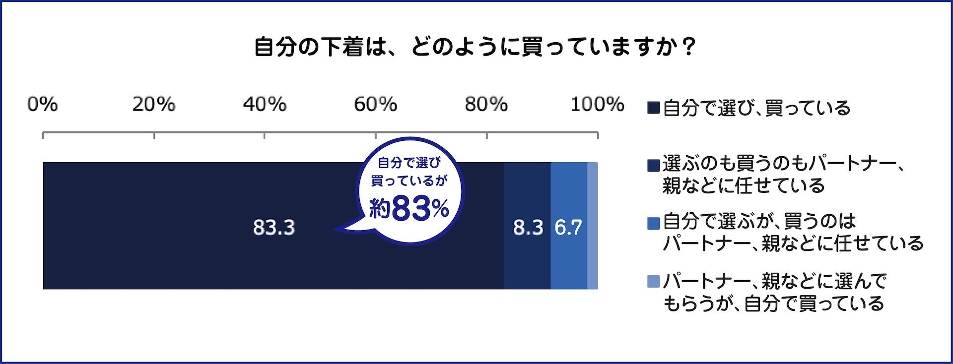 自身の下着の購買行動として、83.3%の男性が「自分で選び、買っている」と回答。自分で購入していない人でも「自分で選ぶが、買うのはパートナー、親などに任せている(6.7%)」と答えており、回答者の90%が自分の意思で下着を選んでいます。