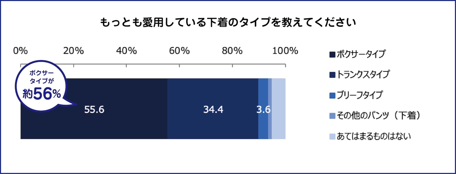 まず、現代の男性がどのような下着を選んでいるのかを理解するため「最も愛用している下着のタイプ」を尋ねたところ、1位「ボクサータイプ(55.6%)」、2位「トランクスタイプ(34.4%)」、3位「ブリーフタイプ(3.6%)」となり、55.6%がボクサータイプ派であることがわかりました。