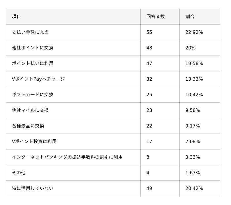 - 三井住友カードの利用で貯まったVポイントの最も定番な活用法は、全体の約23%が挙げた「支払い金額に充当(キャッシュバック)」。一方で、貯まったVポイントを「特に活用していない」層も20%ほど存在する。